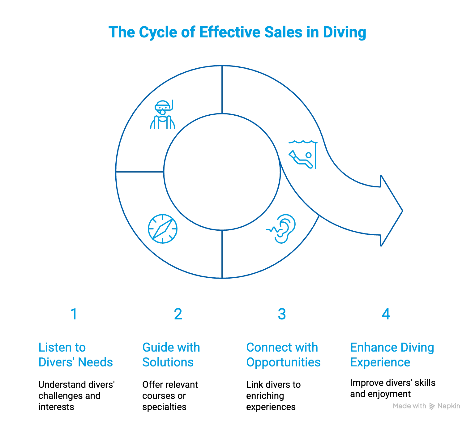 When we see sales as service, we position ourselves as mentors, not salespeople. The diver leaves not only with new skills, but also with greater trust in us as professionals.